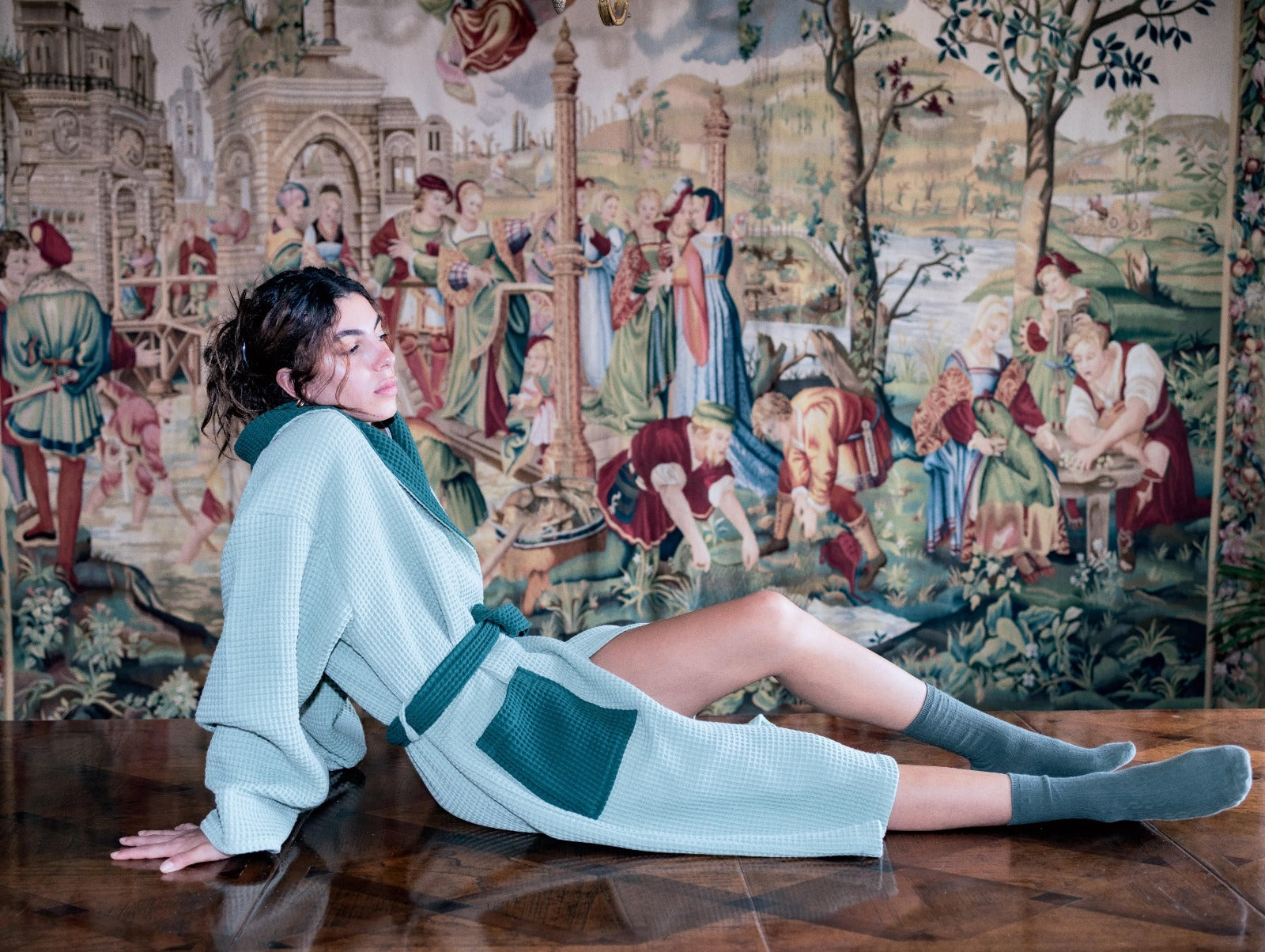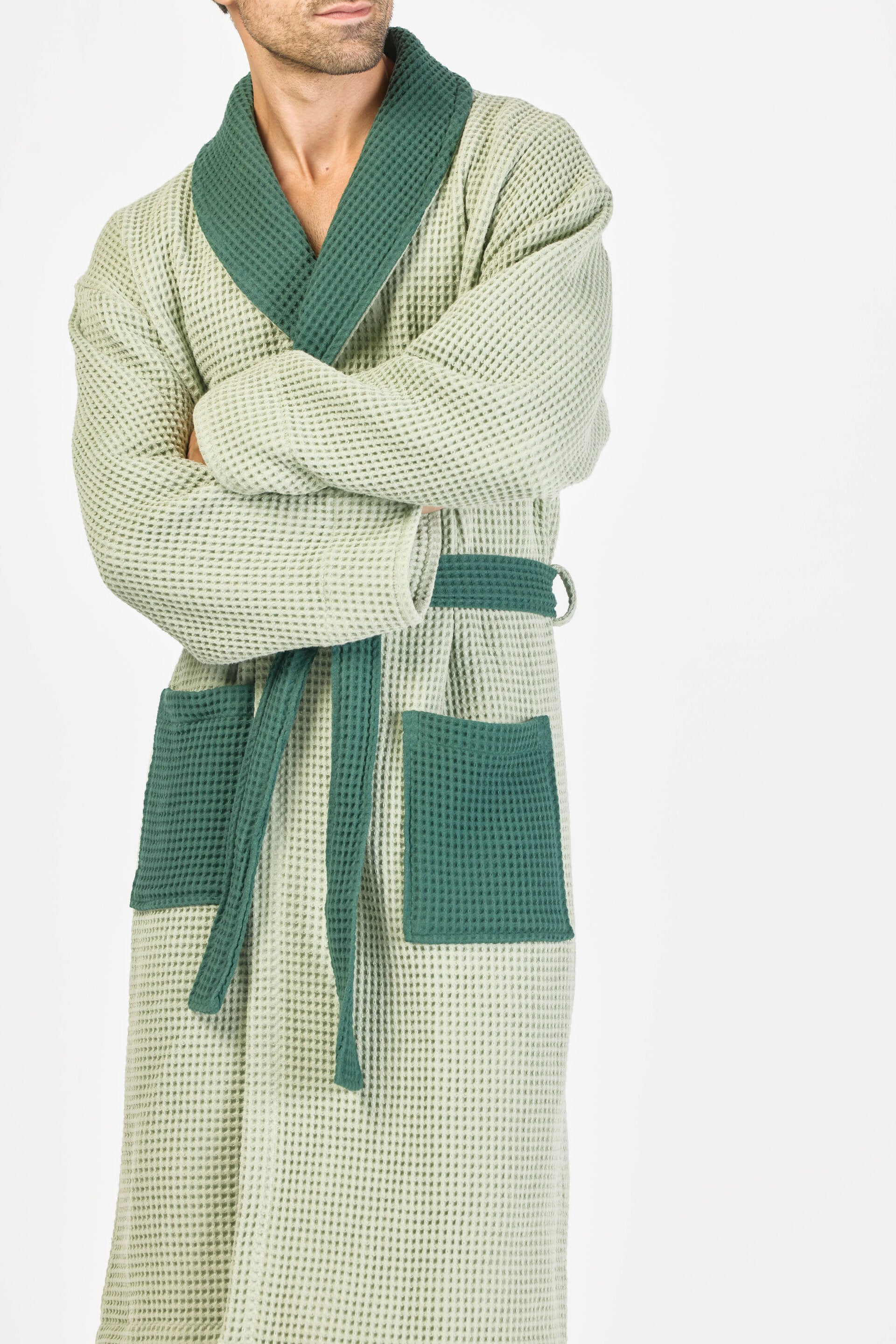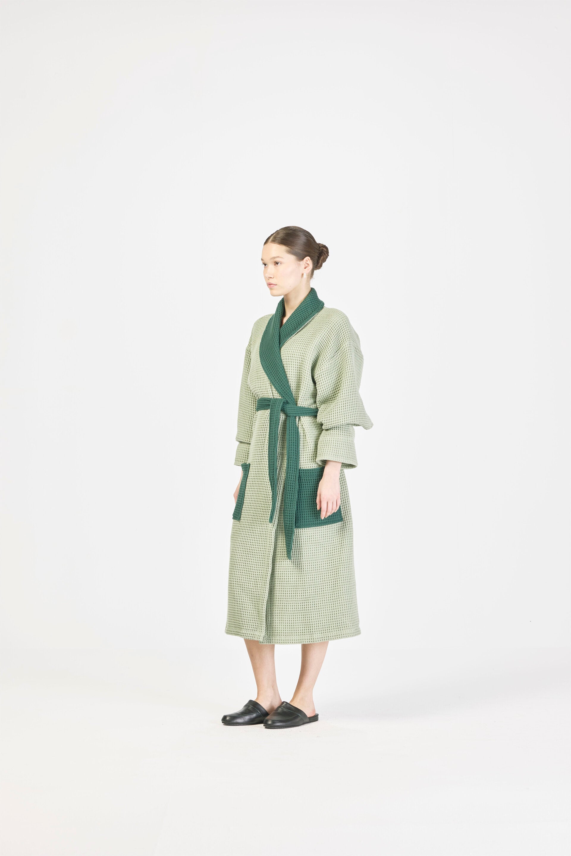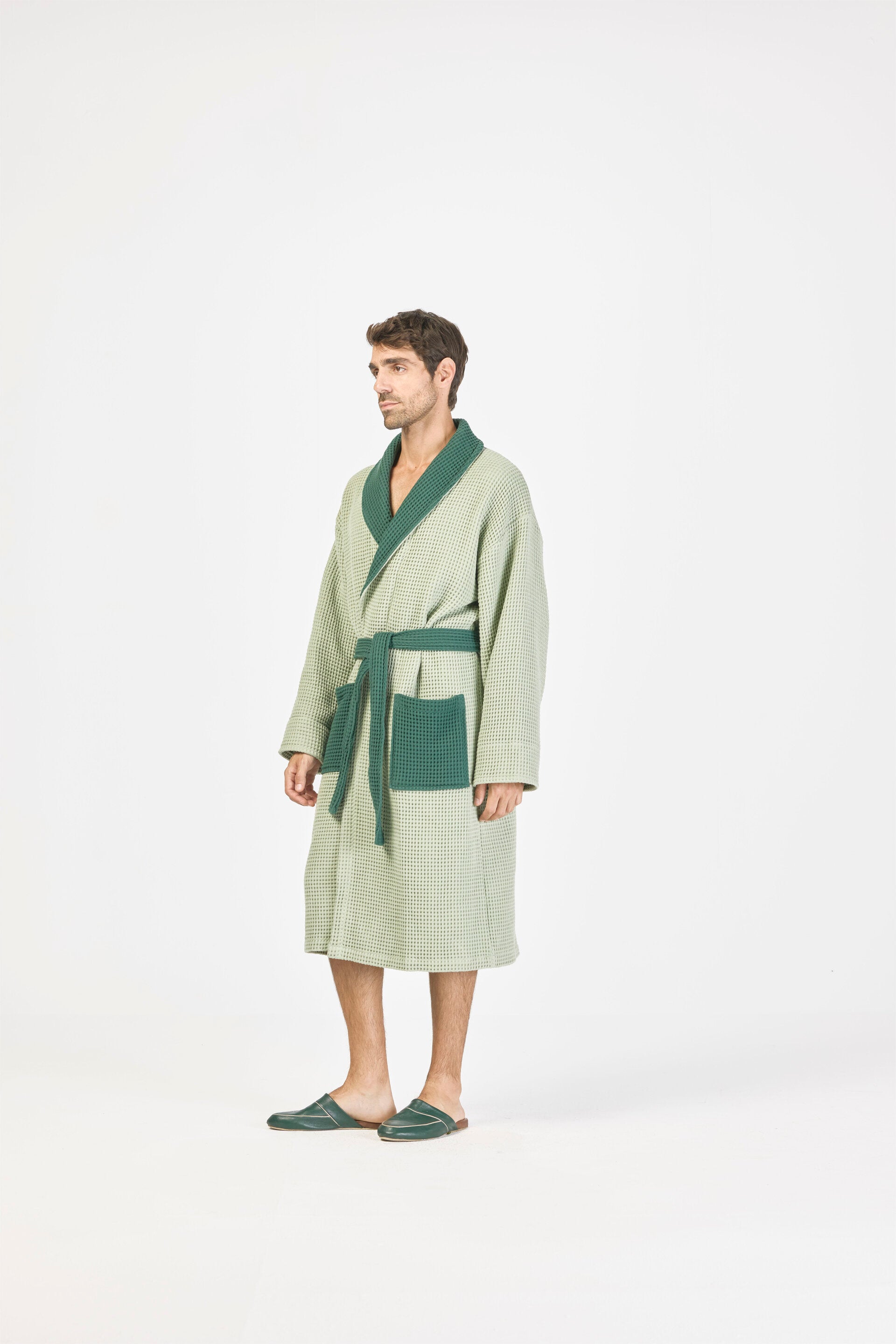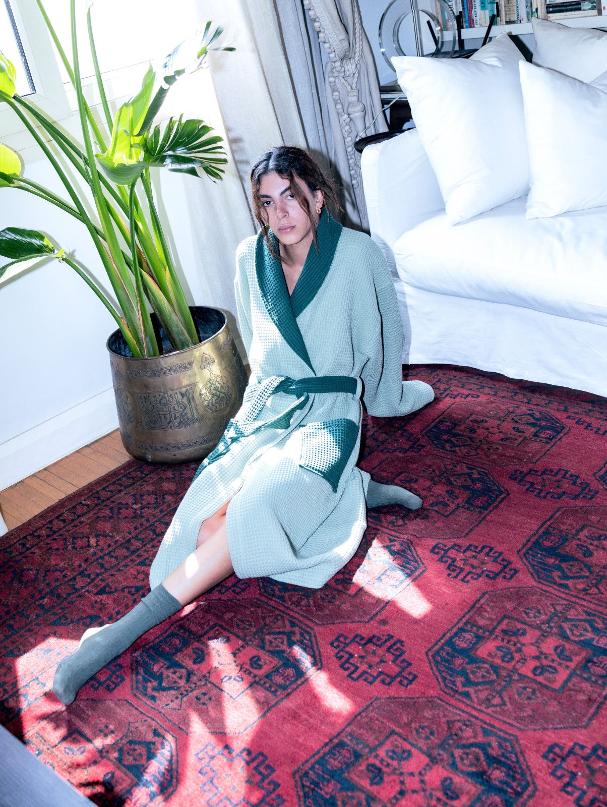 House Babylon’s two toned waffle bathrobe is crafted from organic Turkish cotton and is Oeko-Tex certified to be fully free of any harmful chemicals. The waffle bathrobe is lightweight, softly textured and woven at 230 grams per square meter. This unisex bathrobe offers a relaxed fit featuring a lapel and capacious pockets. Made in Turkey.