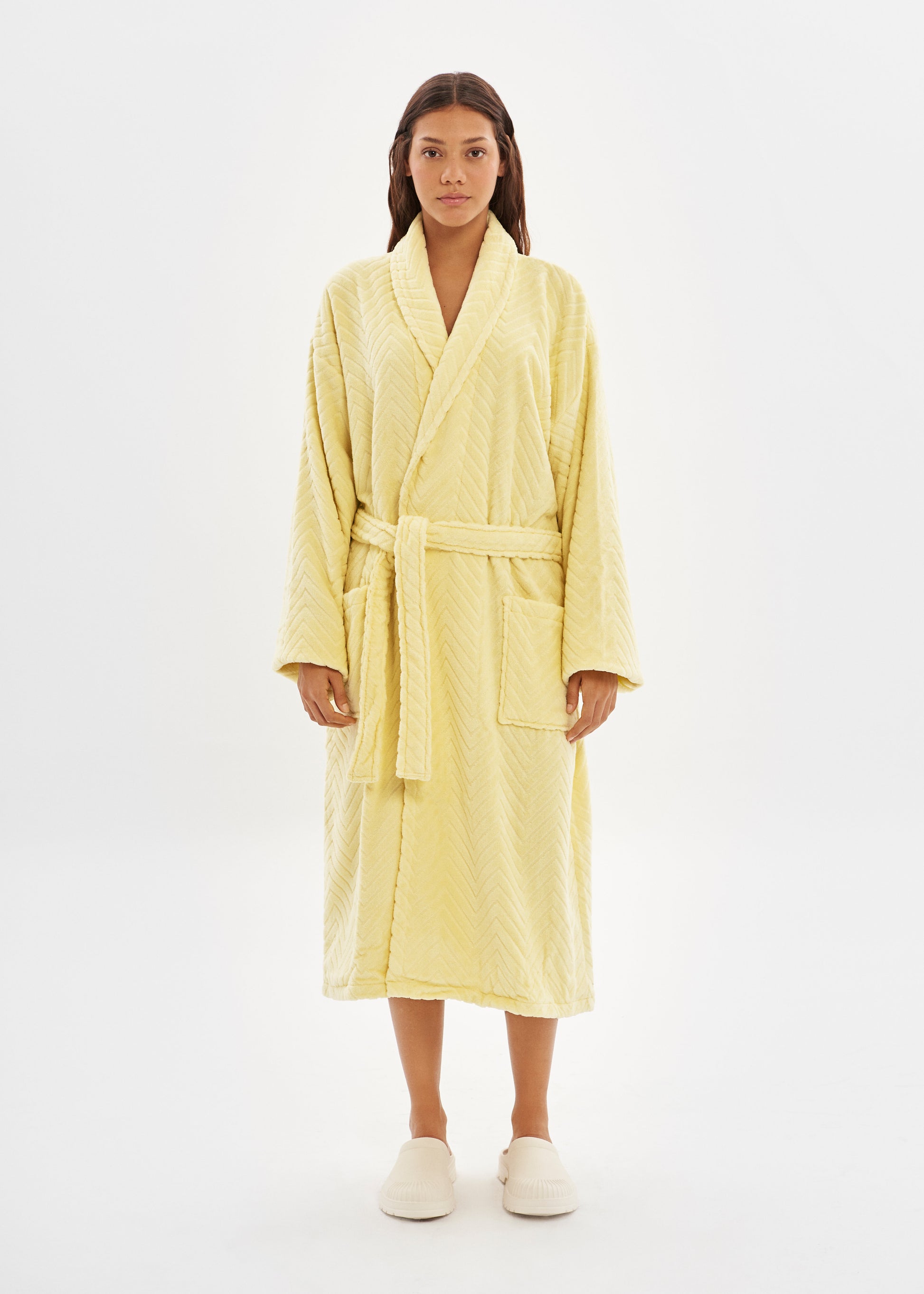 House Babylon’s bathrobe is crafted from organic Turkish cotton and is Oeko-Tex certified to be fully free of any harmful chemicals. The terrycloth bathrobe is made of 450 GSM long cotton fibers for maximum fluffiness and absorbency. This unisex bathrobe offers a relaxed fit featuring a lapel and capacious pockets. Made in Turkey.