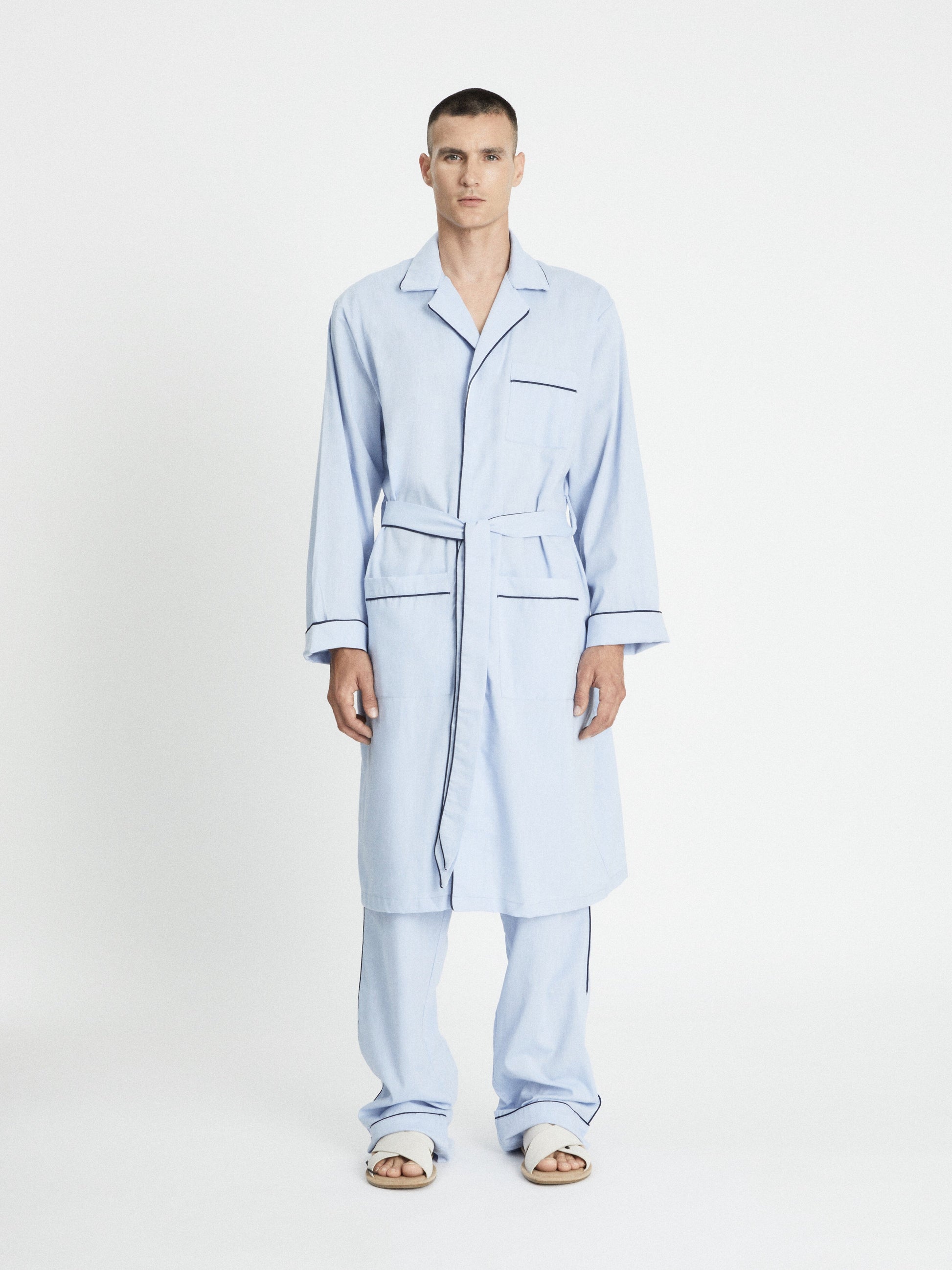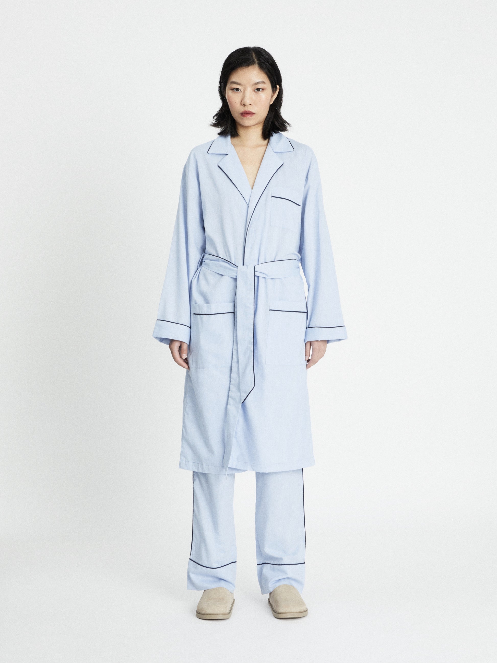House Babylon’s Oxford robes are crafted from a naturally breathable cotton fabric. This unisex robe is designed in crisp oxford with contrasting piping and offers a relaxed fit featuring practical patch pockets, a chest pocket, and a detachable self-fabric belt. Made in Egypt.