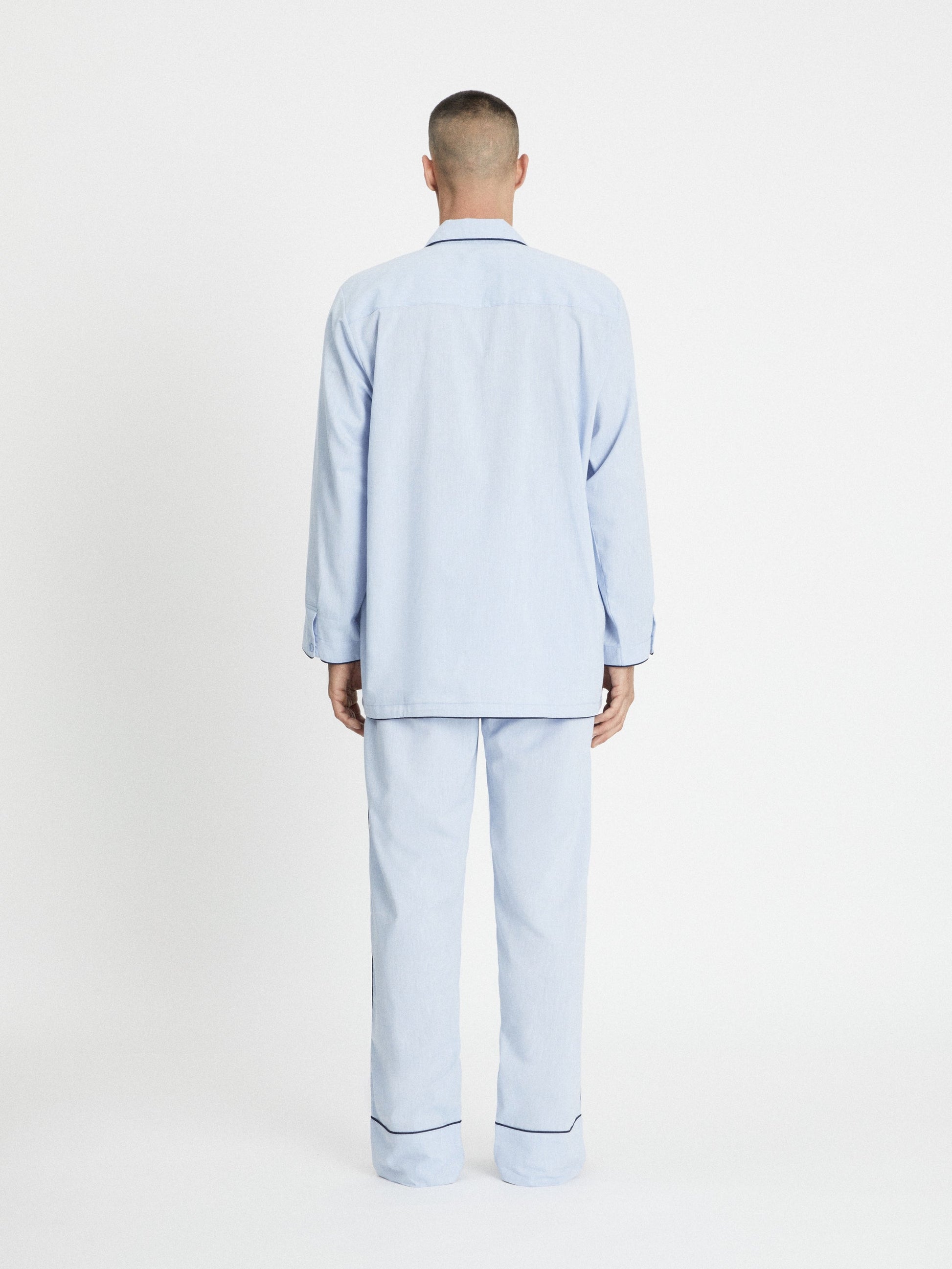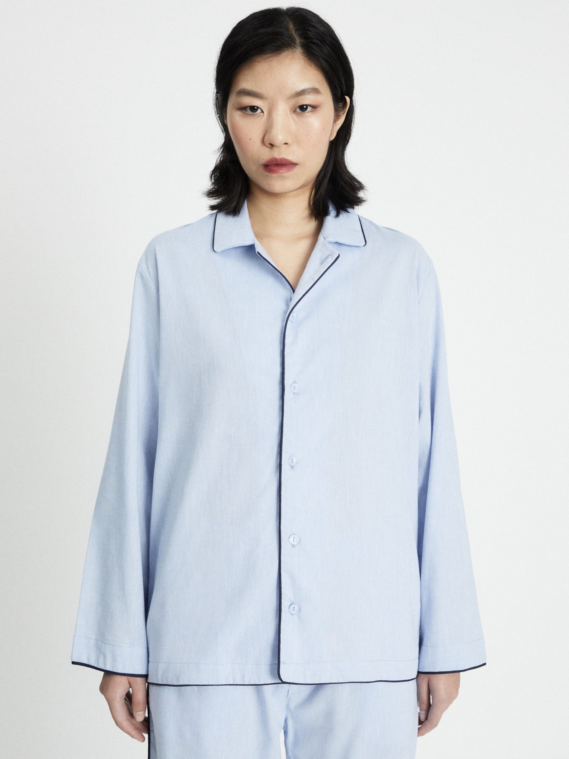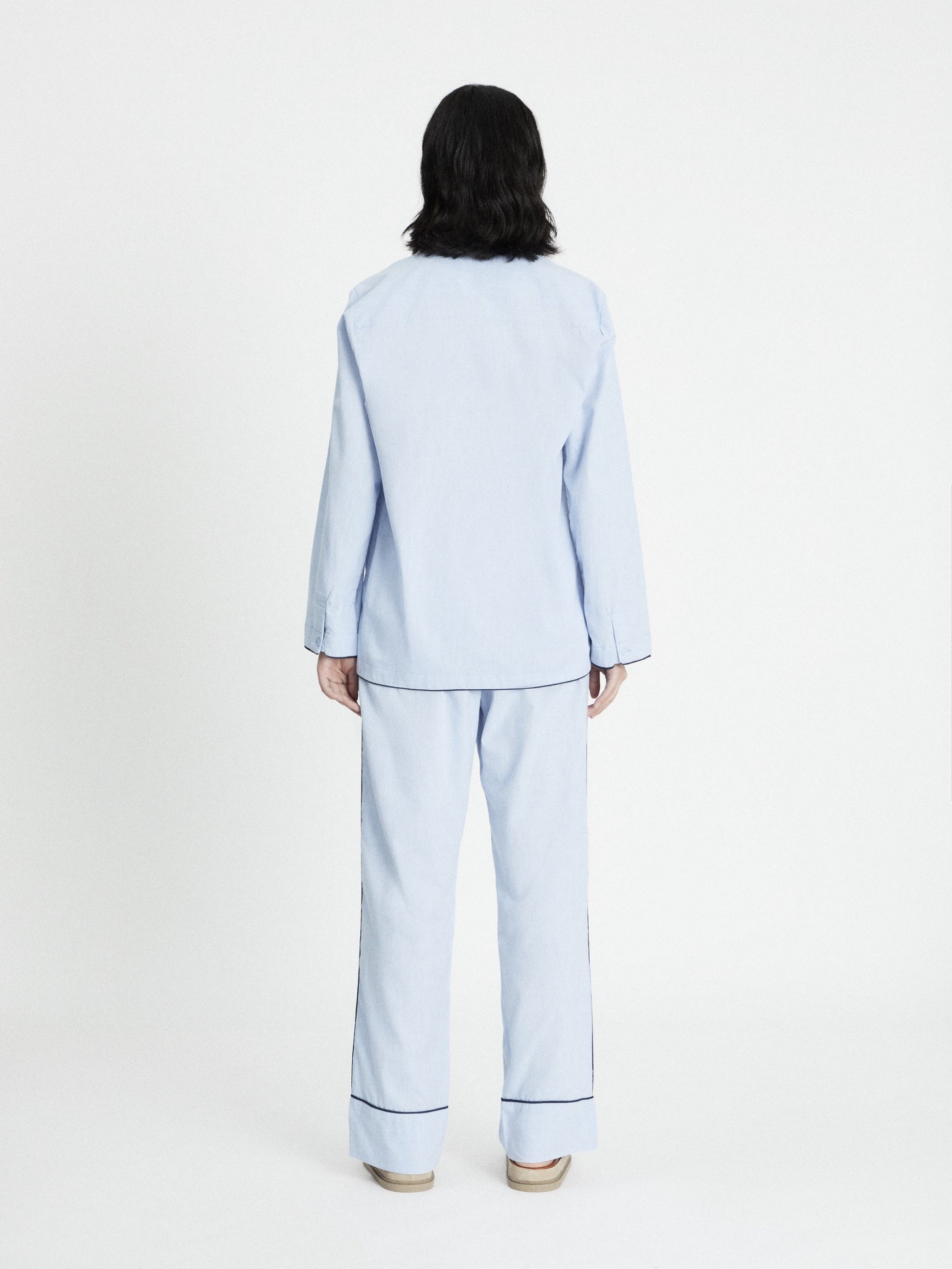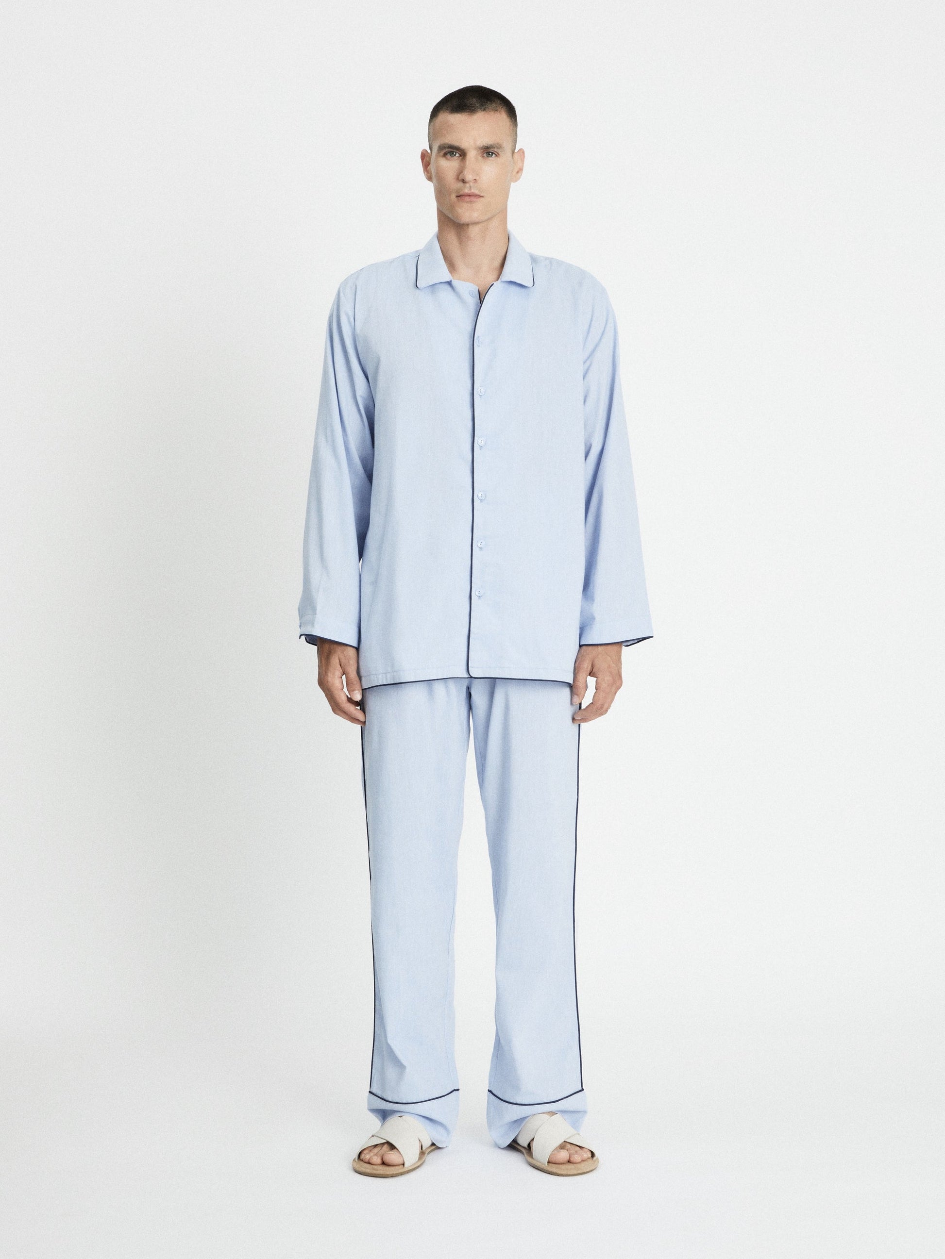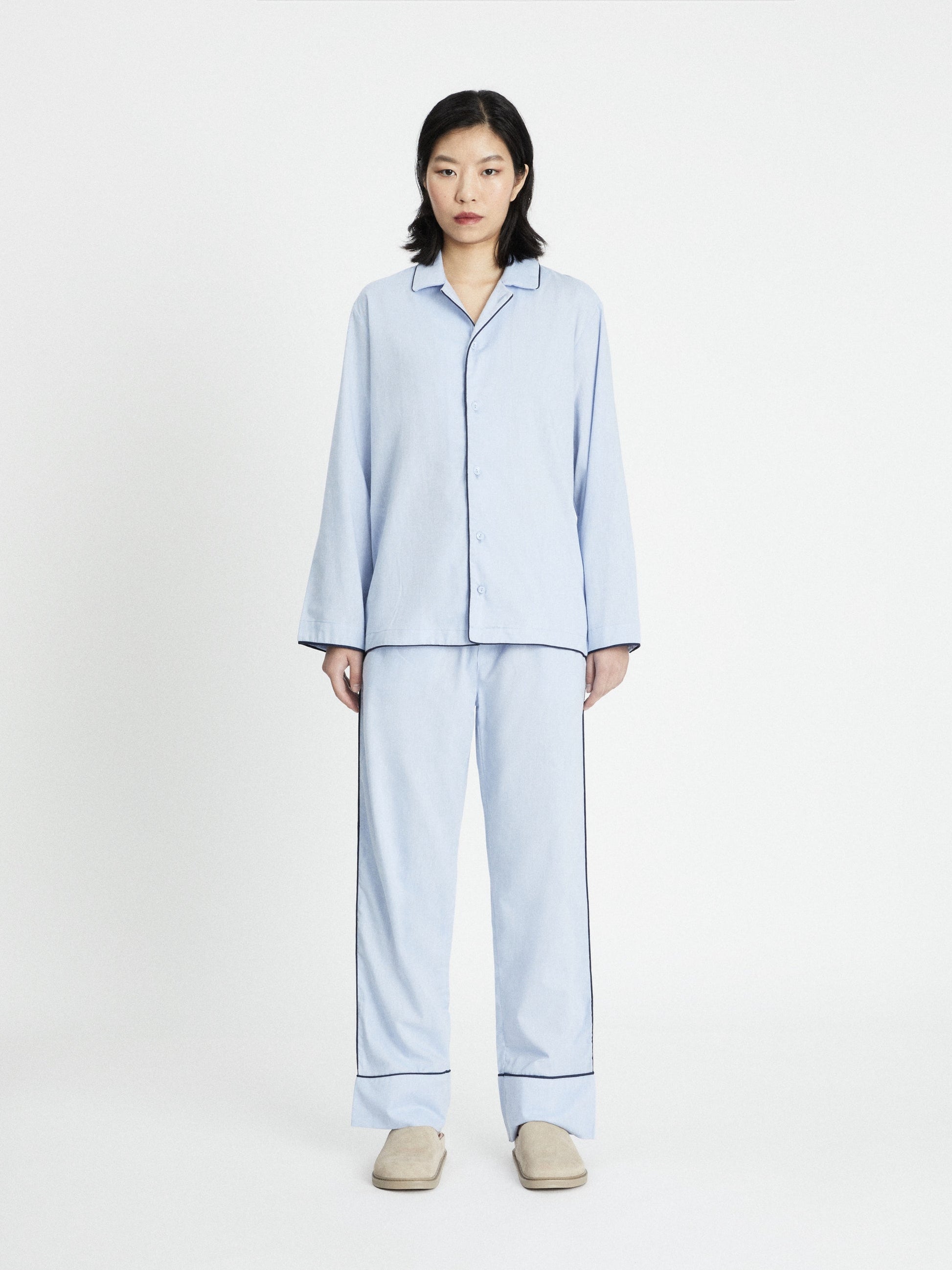 House Babylon’s Oxford sets are crafted from a naturally breathable cotton fabric. This unisex loungewear set is designed in a crisp oxford with contrasting piping and offers a relaxed tapered fit featuring a camp collar, two side pockets, and an elastic waistband with a drawstring. Made in Egypt.