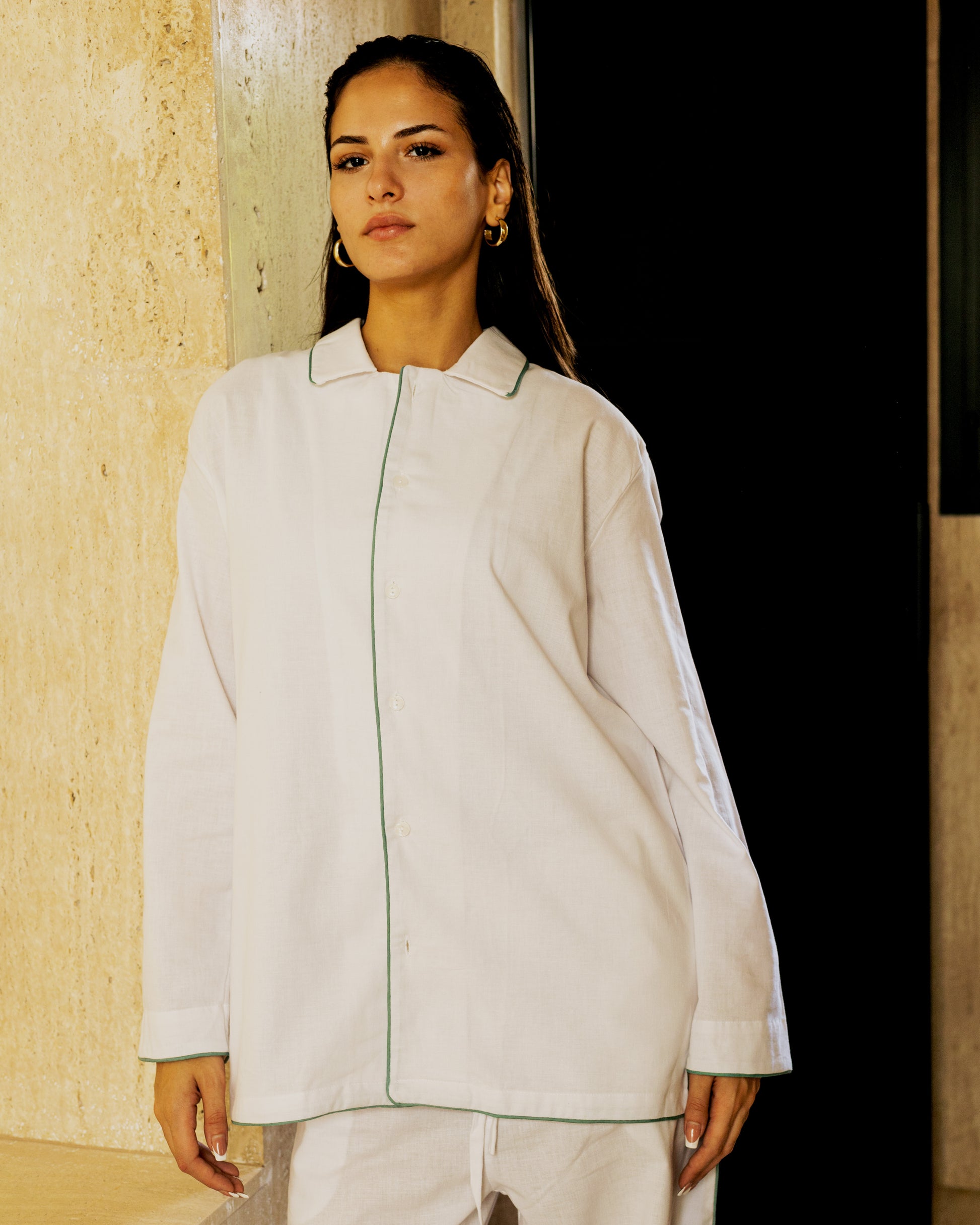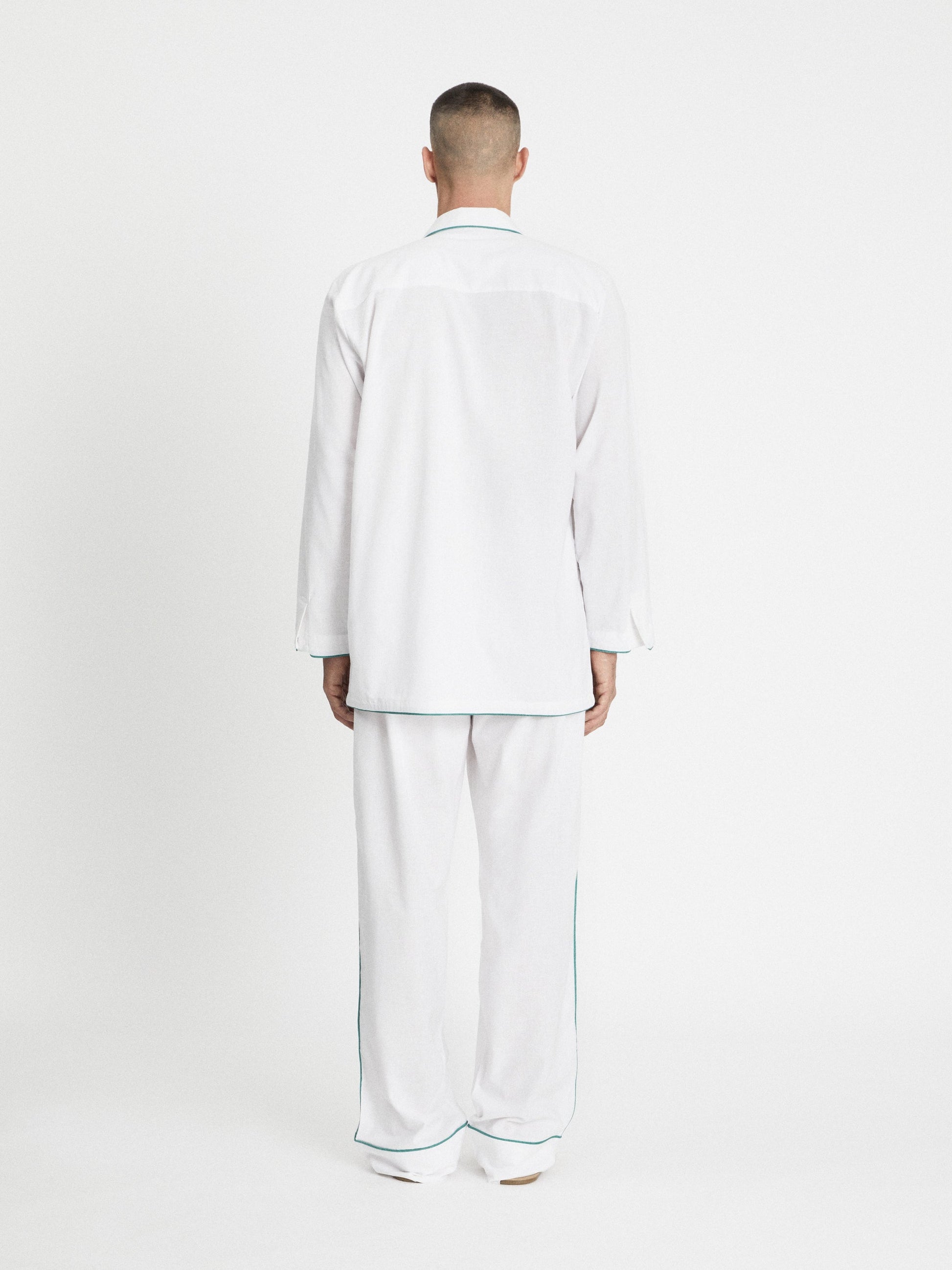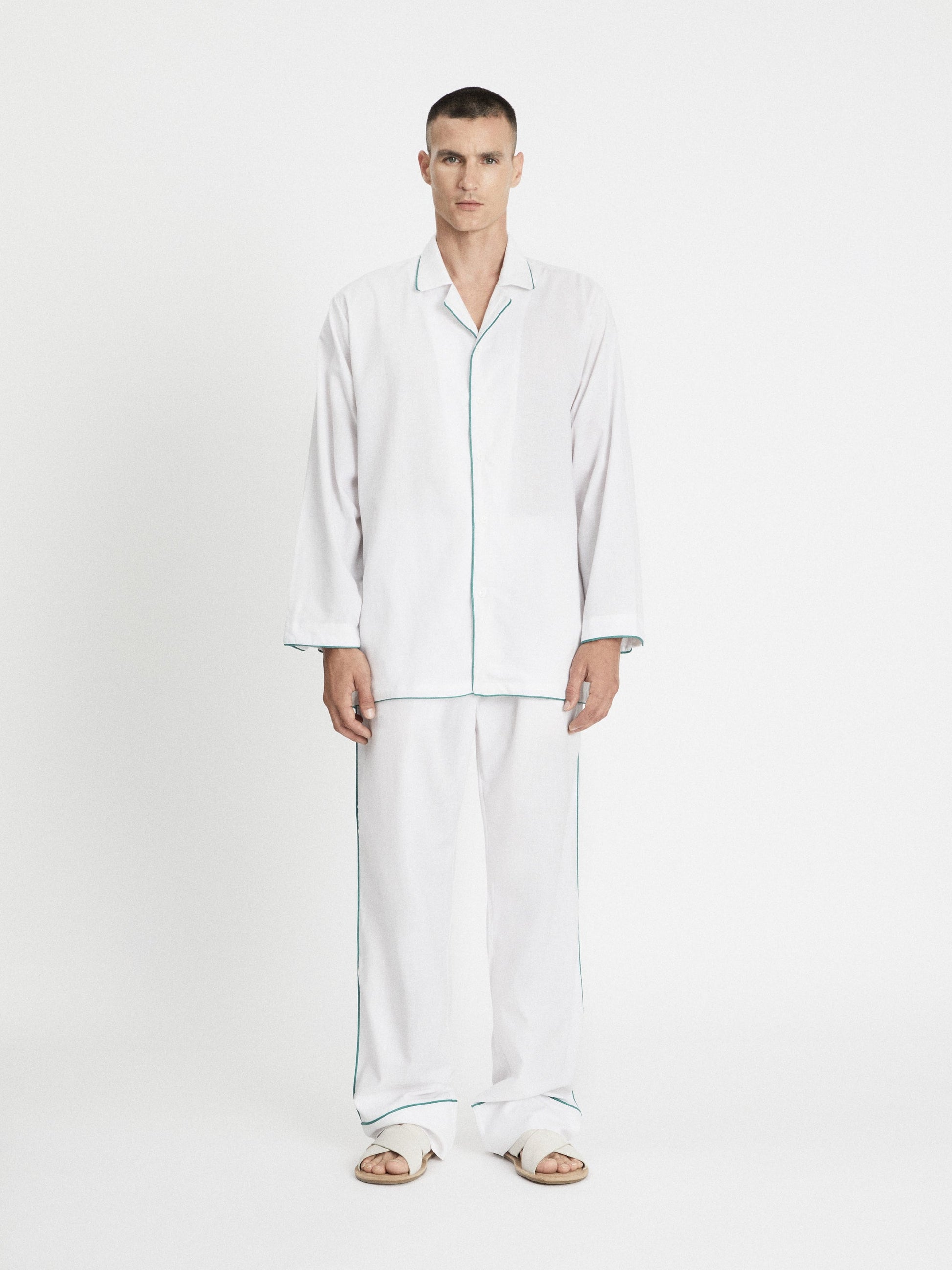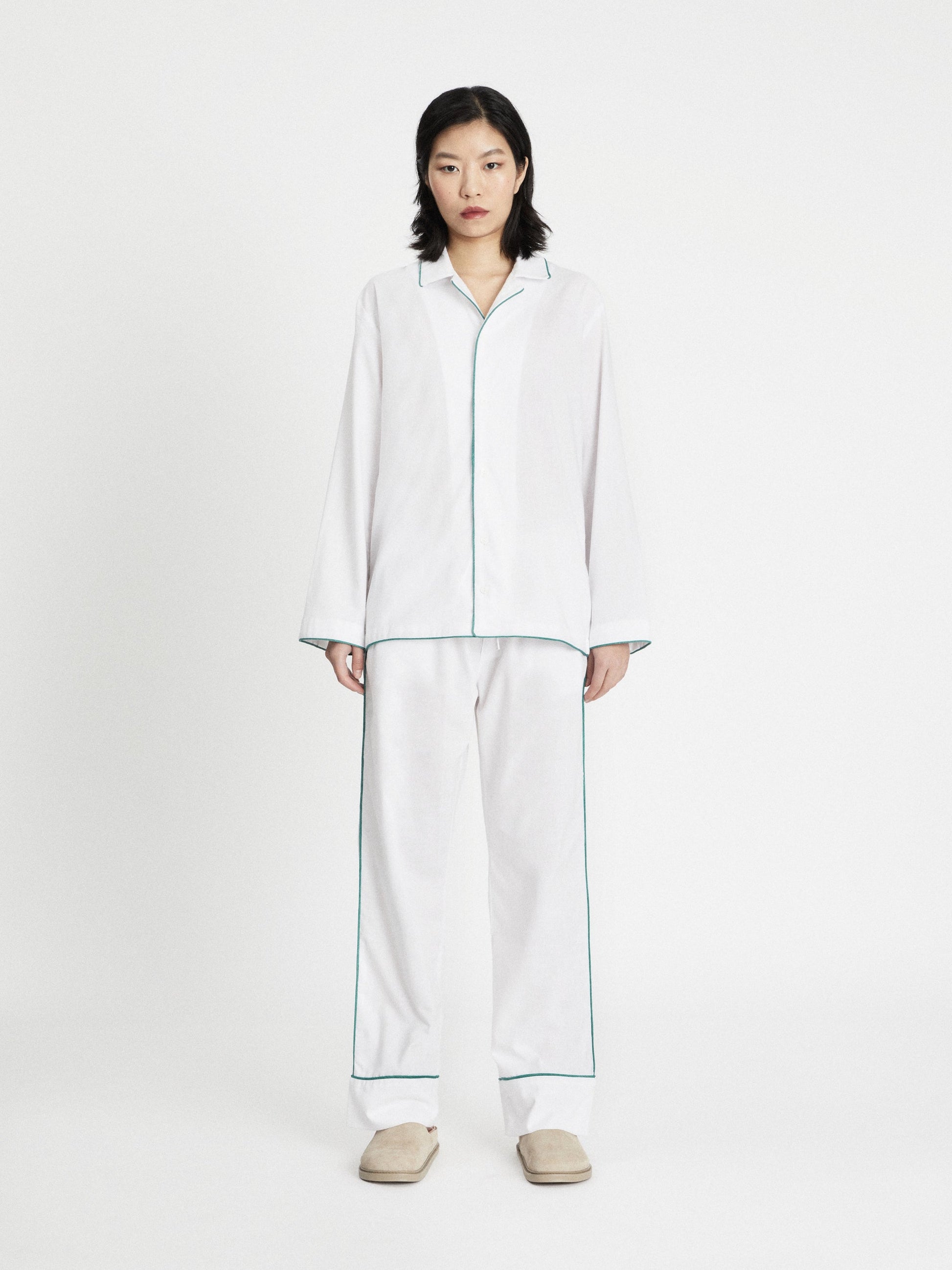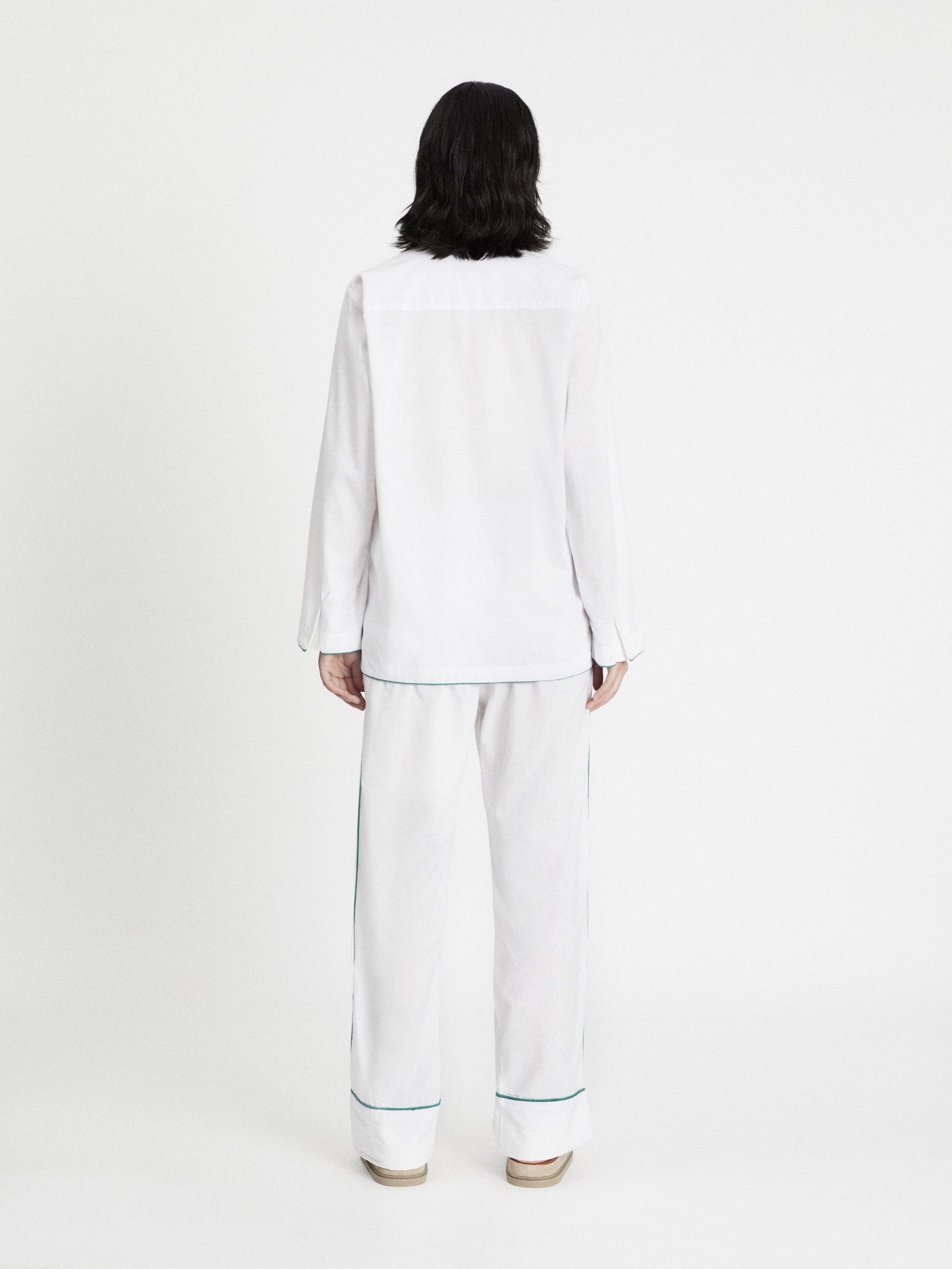 House Babylon’s Oxford sets are crafted from a naturally breathable cotton fabric. This unisex loungewear set is designed in a crisp oxford with contrasting piping and offers a relaxed tapered fit featuring a camp collar, two side pockets, and an elastic waistband with a drawstring. Made in Egypt.