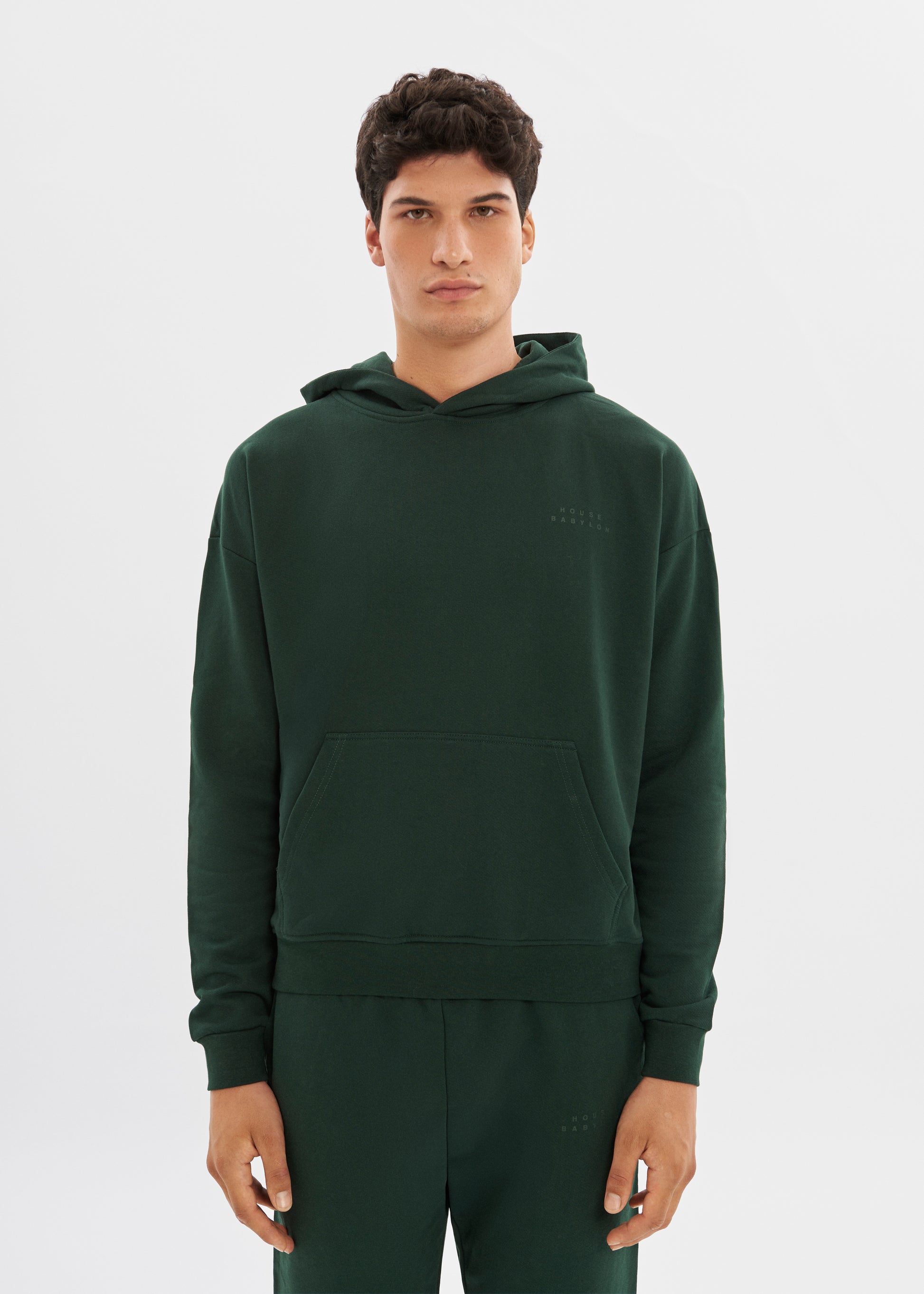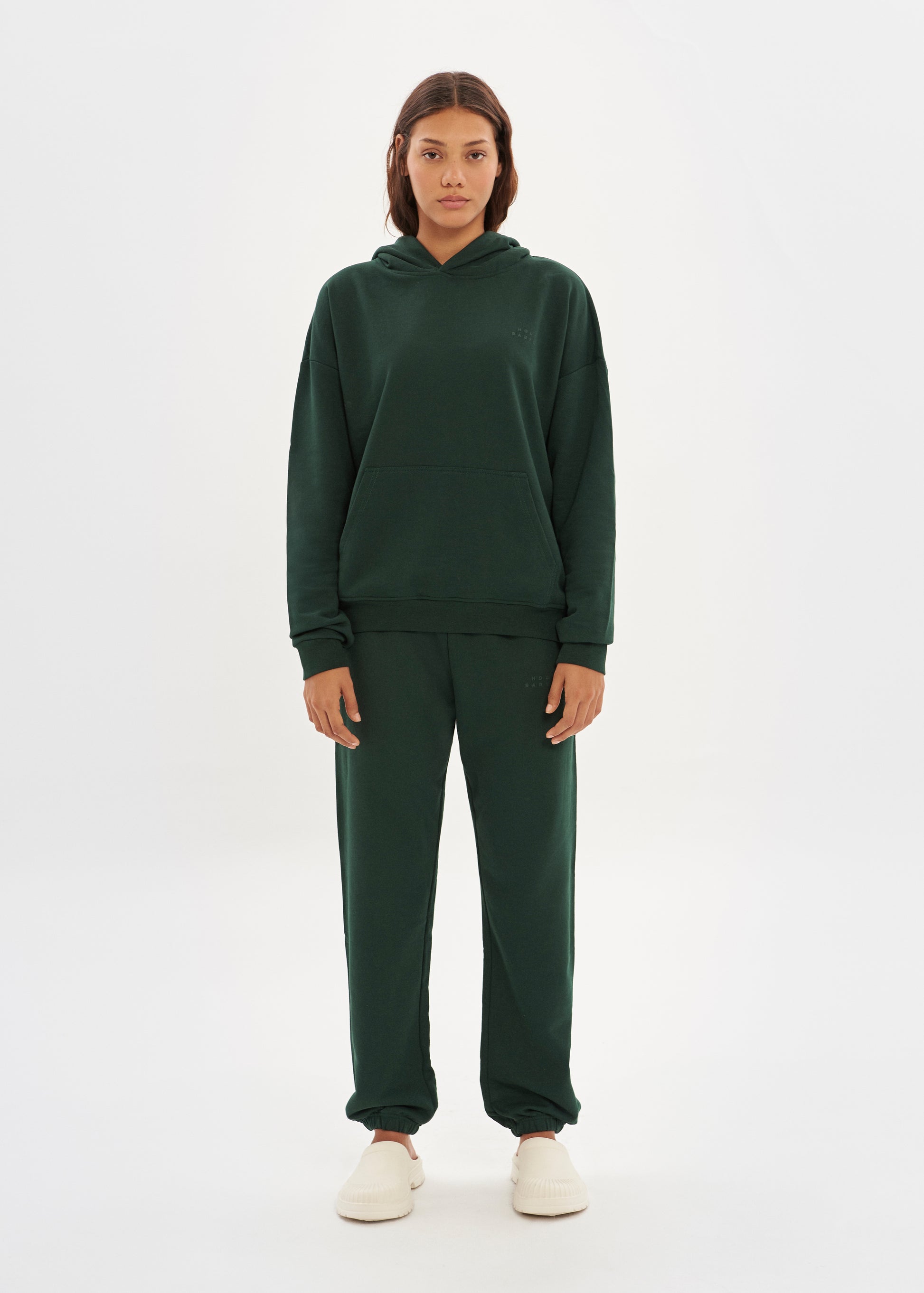 The oversized loungewear set is made from 100% Turkish Cotton. It is a medium-weight fabric, clean cut from a soft touch French Terry and a finishing that provides extra softness. The hooded sweatshirt and pants feature a subtle screen-printed logo at the chest and thigh.