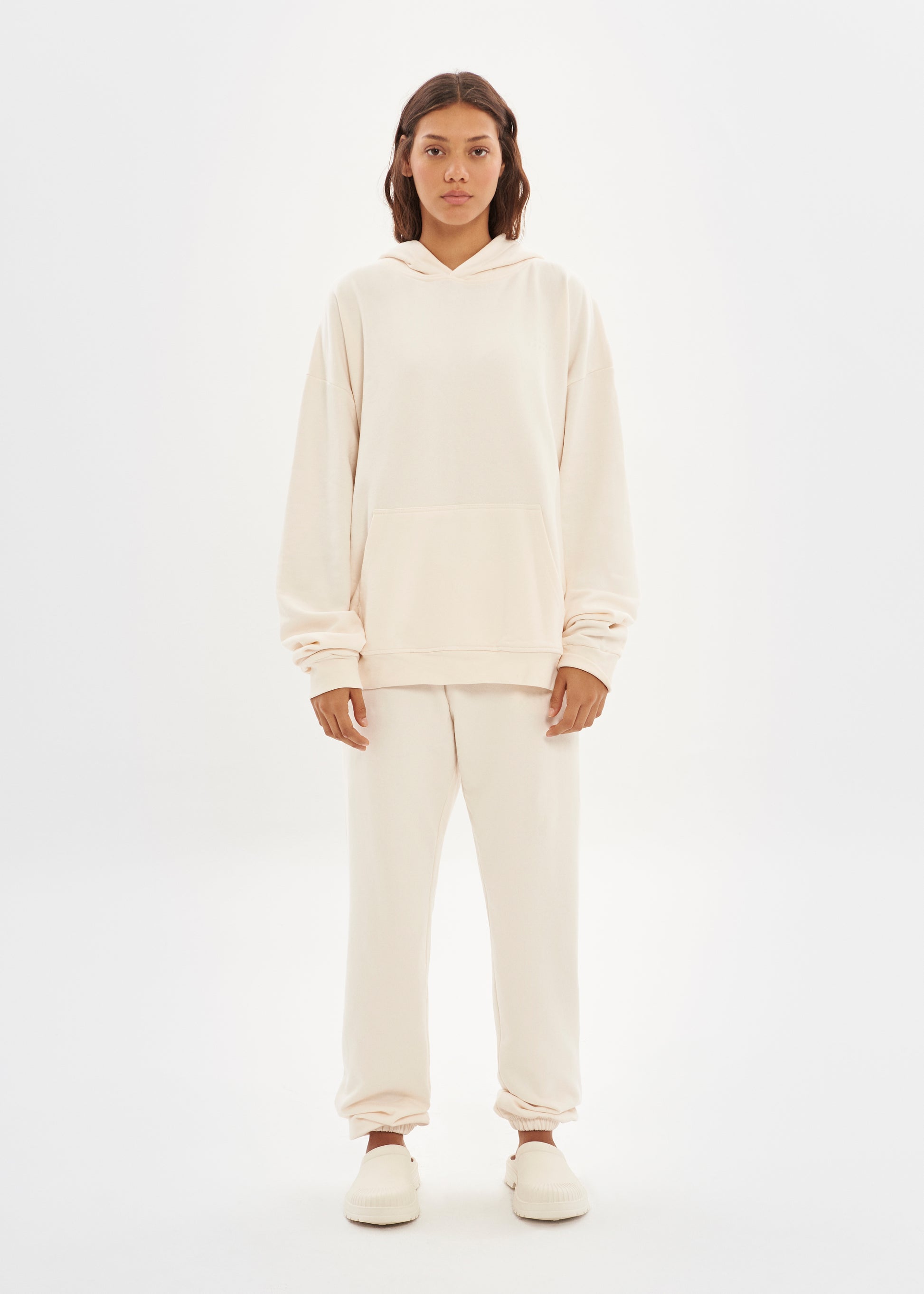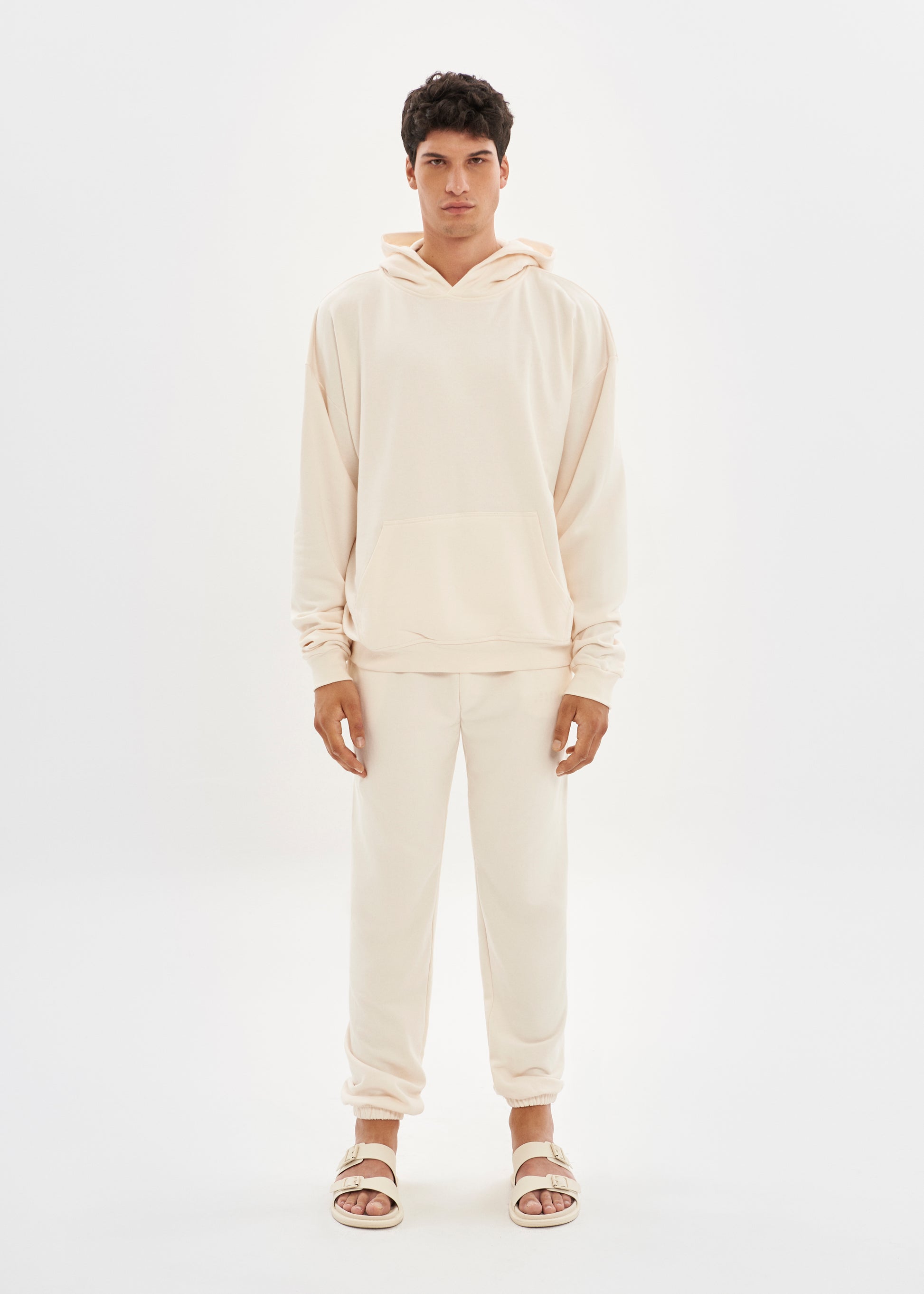 The oversized loungewear set is made from 100% Turkish Cotton. It is a medium-weight fabric, clean cut from a soft touch French Terry and a finishing that provides extra softness. The hooded sweatshirt and pants feature a subtle screen-printed logo at the chest and thigh.